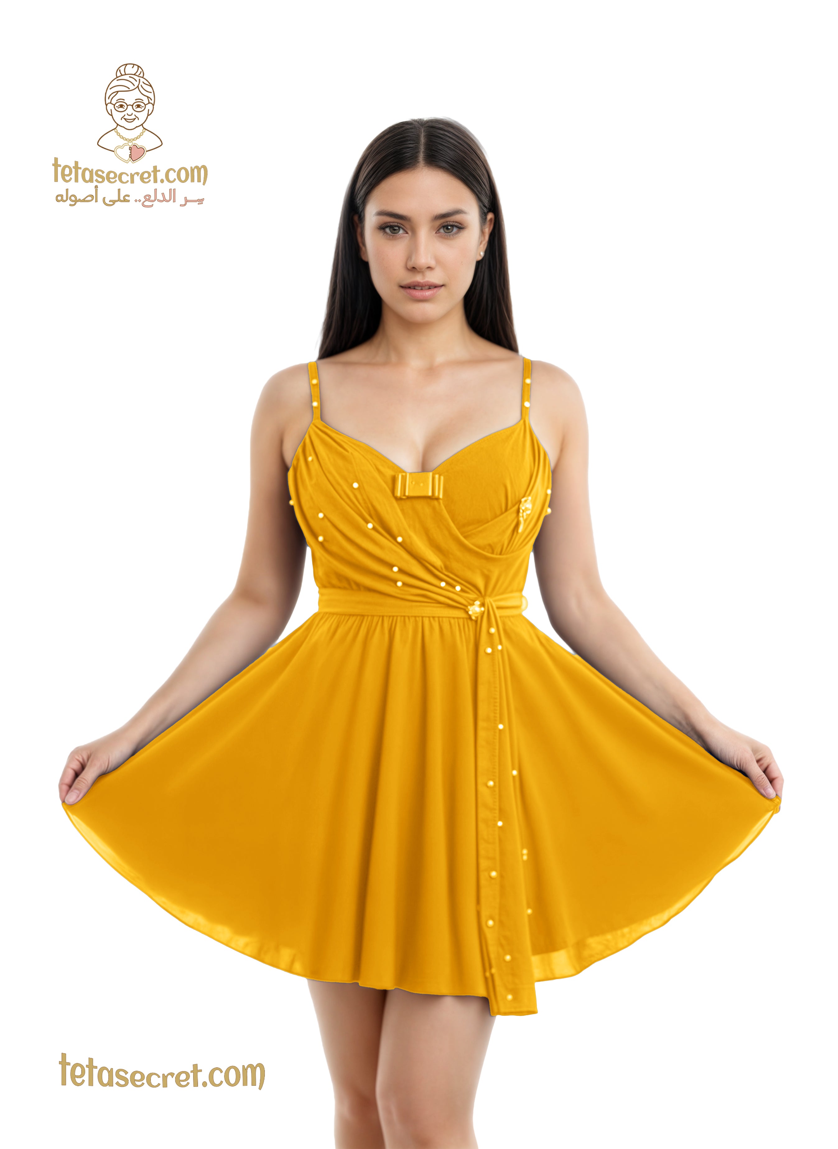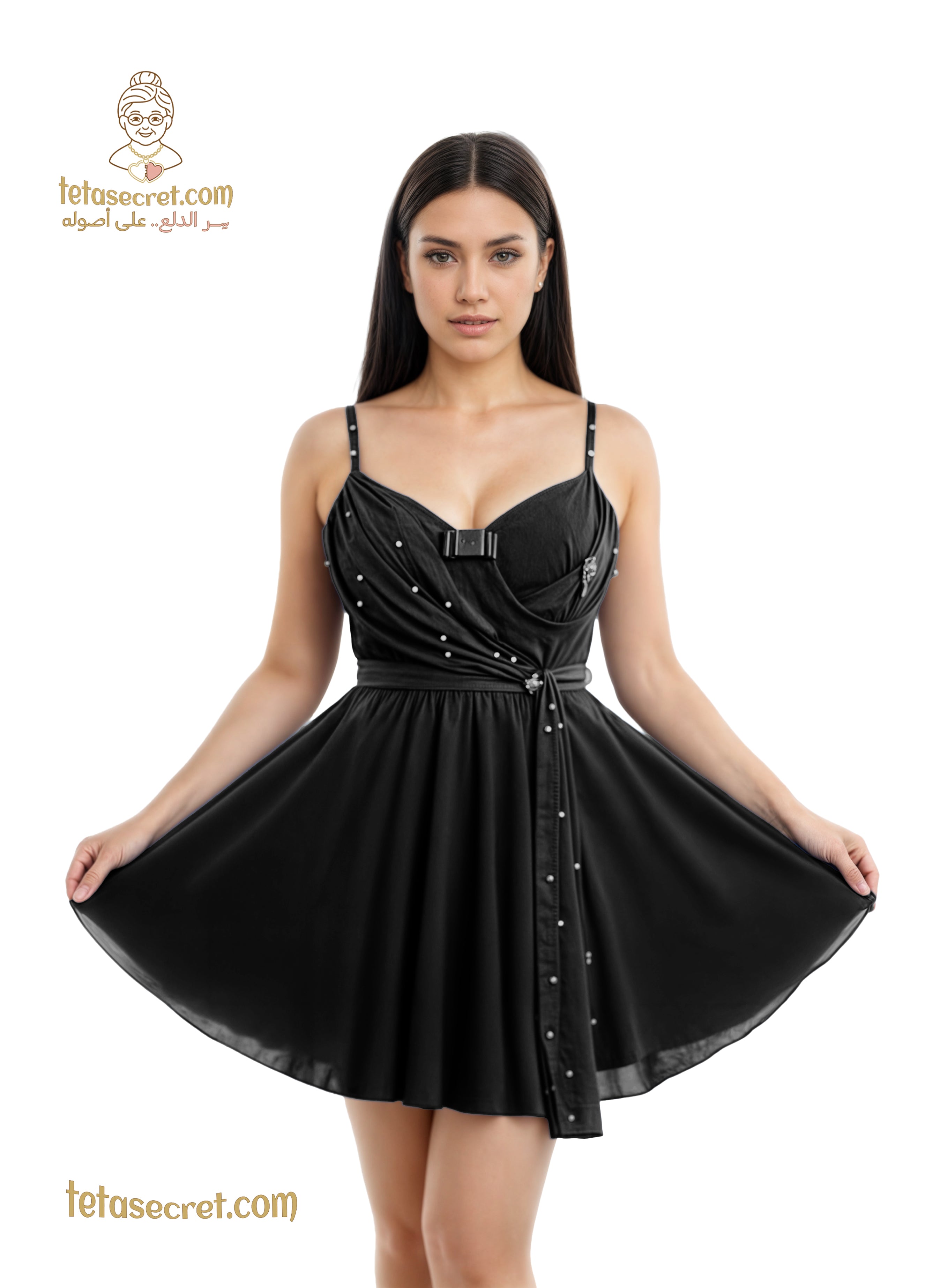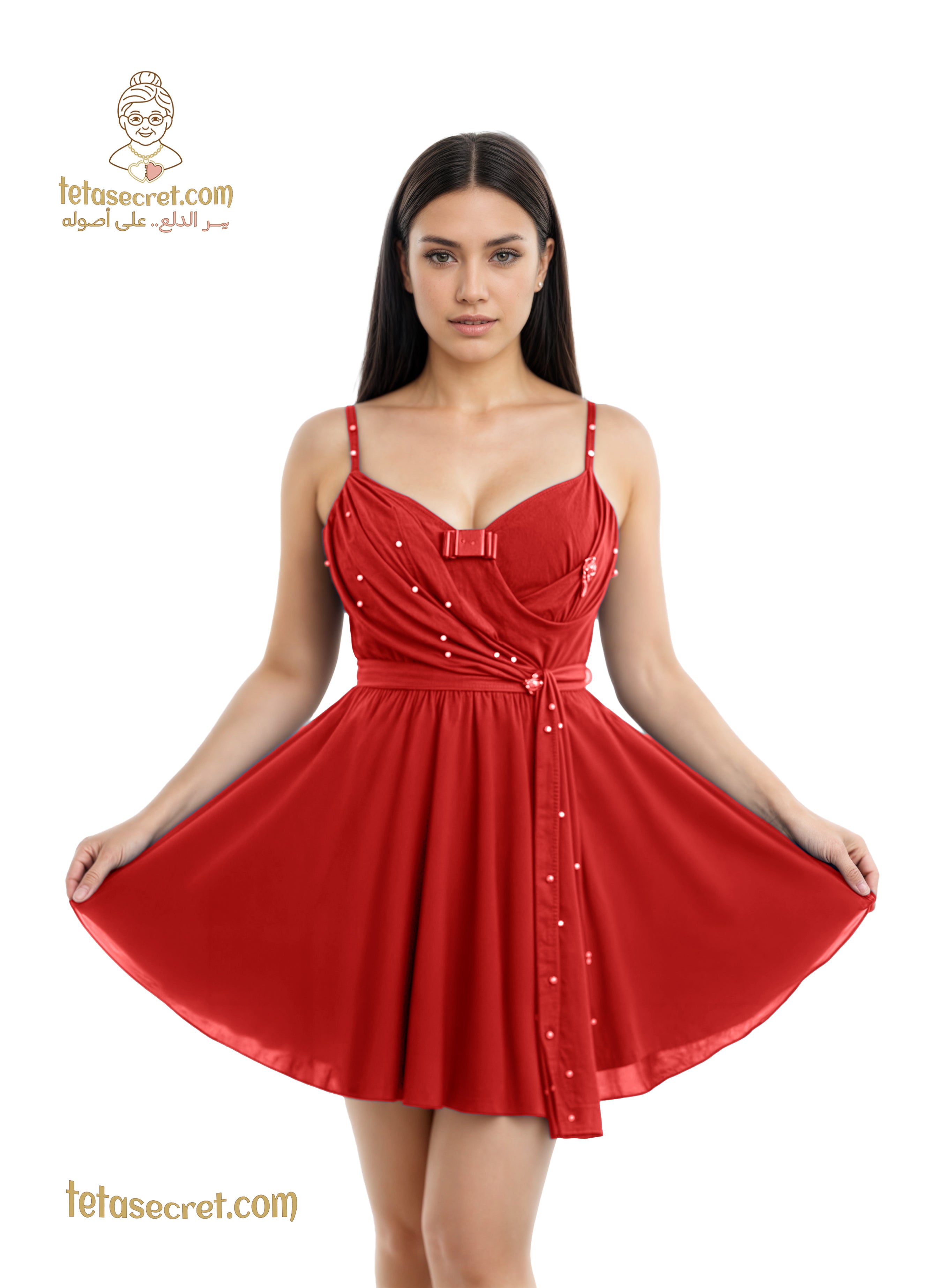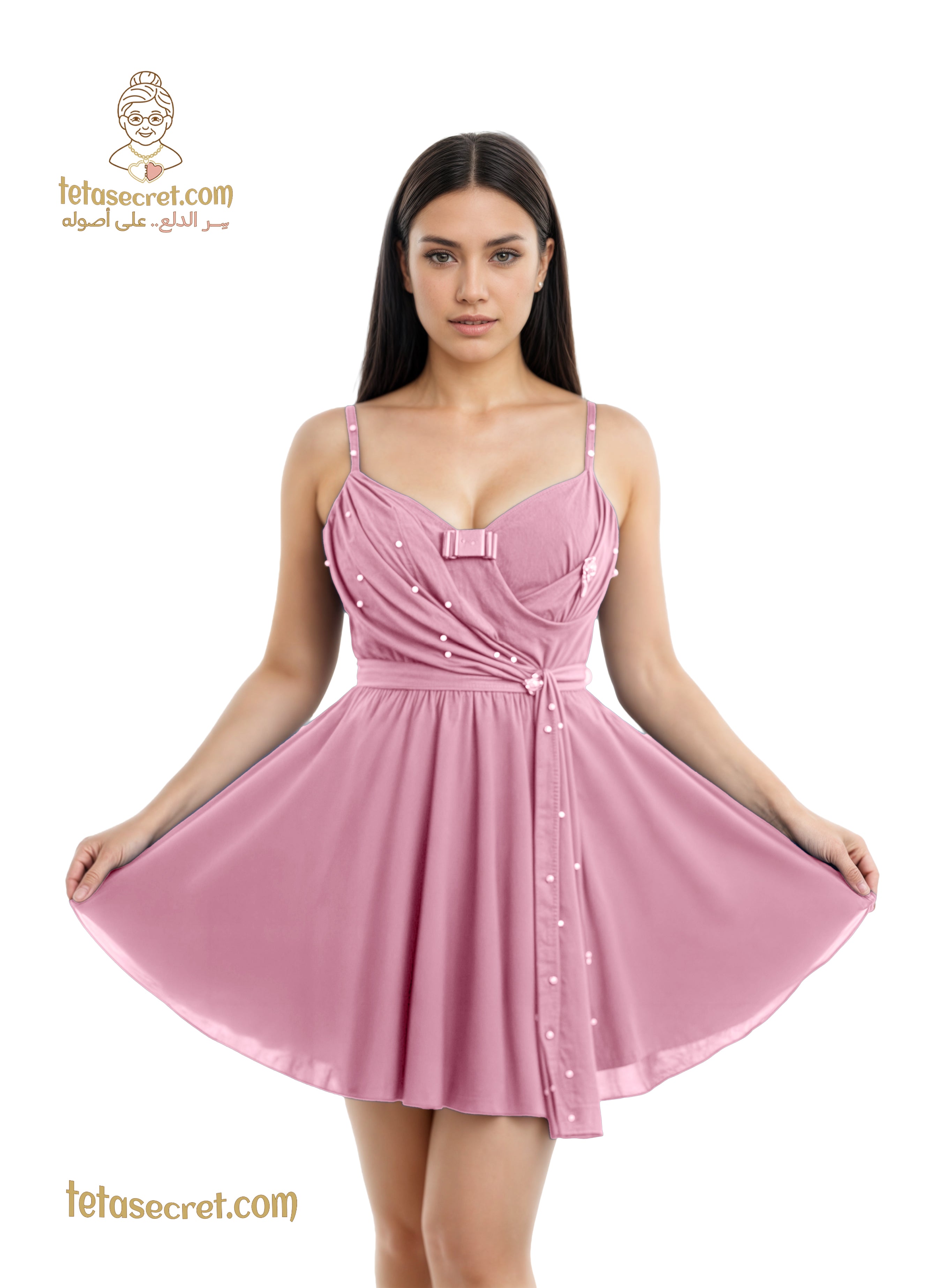قميص نوم برقة ملكية. يتميز بتصميم كورسيه أنيق مع فتحة صدر على شكل قلب وفيونكة رقيقة في المنتصف. وشاح جانبي منسدل مرصع بحبات لؤلؤ بيضاء يضيف لمسة من الرقي والأنوثة. الخصر محدد بحزام ناعم تنسدل منه تنورة واسعة توفر حركة انسيابية مريحة وجذابة. تصميم يجمع بين الفخامة والراحة لليالٍ مميزة.